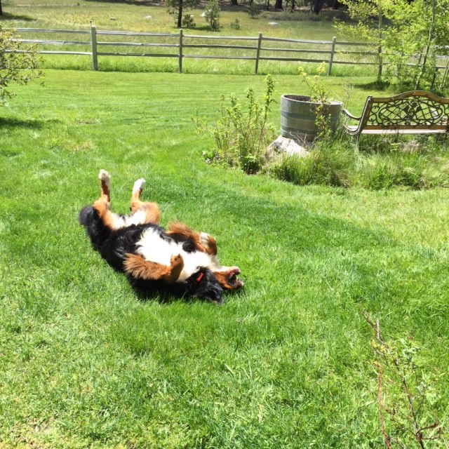 IMG_1479I caught Echo out of the corner of my eye as he was rolling down the hill on the far side of our property. When he reached the bottom he’d jump up and run to the top of the hill to roll down again. I suddenly realized that the sun was high in the sky, the temperature perfect, the flowers colorful, and it had turned out to be one of the most awesome days we’d had all summer. I realized that it had been weeks since I’d been fully in the moment, neither thinking of what lay ahead or what had just occurred.